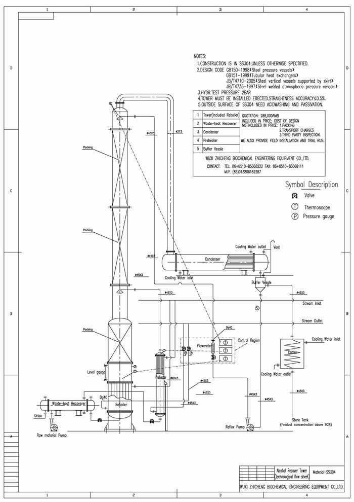 本裝置適用于制藥、食品、輕工、化工等行業的稀酒精回收。也適用于甲醇等其他溶煤的蒸餾。本裝置根據用戶的需要,可根據30℃左右的稀酒精蒸餾至90-95℃酒精,成品酒精度數要求再高,可以加大回流比,但產量就相應減少。